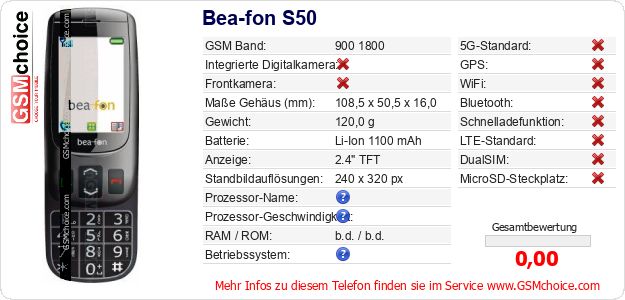 Hast du eigene Webseite? Willst du die Informationen über Standarddaten des Handys Bea-fon S50 irgendwo veröffentlichen? Das ist sehr einfach. Du kannst das Bild herunterladen oder kopieren und auf der Webseite folgenden Code hinzufügen:Das Einfügen von diesem Code verursacht das Anzeigen von dem folgenden Bild: