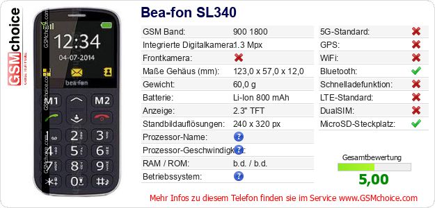Hast du eigene Webseite? Willst du die Informationen über Standarddaten des Handys Bea-fon SL340 irgendwo veröffentlichen? Das ist sehr einfach. Du kannst das Bild herunterladen oder kopieren und auf der Webseite folgenden Code hinzufügen:Das Einfügen von diesem Code verursacht das Anzeigen von dem folgenden Bild:
