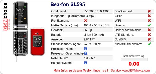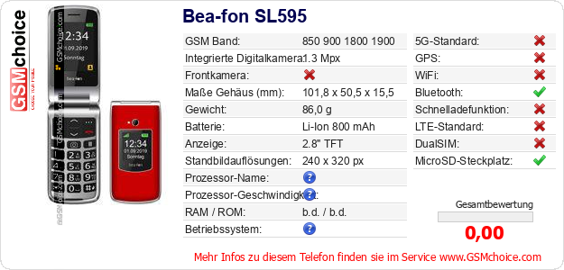 Hast du eigene Webseite? Willst du die Informationen über Standarddaten des Handys Bea-fon SL595 irgendwo veröffentlichen? Das ist sehr einfach. Du kannst das Bild herunterladen oder kopieren und auf der Webseite folgenden Code hinzufügen:Das Einfügen von diesem Code verursacht das Anzeigen von dem folgenden Bild: