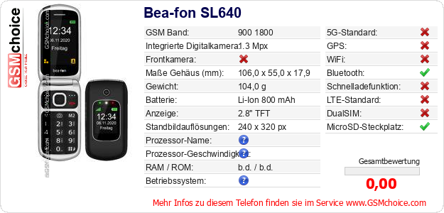 Hast du eigene Webseite? Willst du die Informationen über Standarddaten des Handys Bea-fon SL640 irgendwo veröffentlichen? Das ist sehr einfach. Du kannst das Bild herunterladen oder kopieren und auf der Webseite folgenden Code hinzufügen:Das Einfügen von diesem Code verursacht das Anzeigen von dem folgenden Bild: