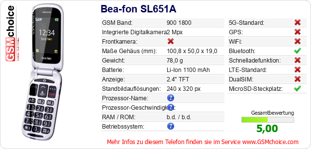 Daten des Mobiltelefons Bea-fon SL651A auf Ihrer Seite