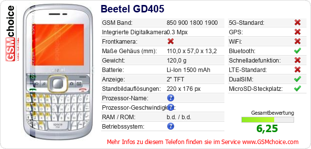 Hast du eigene Webseite? Willst du die Informationen über Standarddaten des Handys Beetel GD405 irgendwo veröffentlichen? Das ist sehr einfach. Du kannst das Bild herunterladen oder kopieren und auf der Webseite folgenden Code hinzufügen:Das Einfügen von diesem Code verursacht das Anzeigen von dem folgenden Bild: