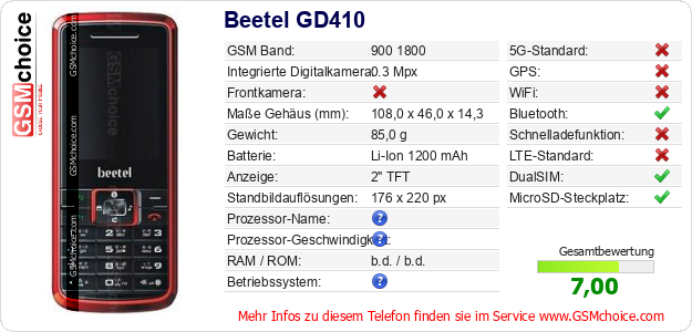 Hast du eigene Webseite? Willst du die Informationen über Standarddaten des Handys Beetel GD410 irgendwo veröffentlichen? Das ist sehr einfach. Du kannst das Bild herunterladen oder kopieren und auf der Webseite folgenden Code hinzufügen:Das Einfügen von diesem Code verursacht das Anzeigen von dem folgenden Bild: