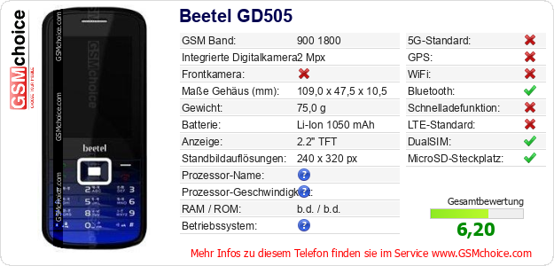 Hast du eigene Webseite? Willst du die Informationen über Standarddaten des Handys Beetel GD505 irgendwo veröffentlichen? Das ist sehr einfach. Du kannst das Bild herunterladen oder kopieren und auf der Webseite folgenden Code hinzufügen:Das Einfügen von diesem Code verursacht das Anzeigen von dem folgenden Bild: