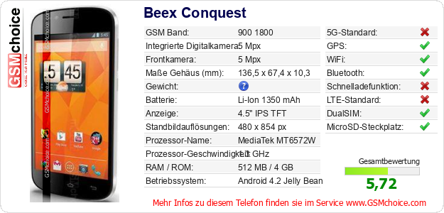 Hast du eigene Webseite? Willst du die Informationen über Standarddaten des Handys Beex Conquest irgendwo veröffentlichen? Das ist sehr einfach. Du kannst das Bild herunterladen oder kopieren und auf der Webseite folgenden Code hinzufügen:Das Einfügen von diesem Code verursacht das Anzeigen von dem folgenden Bild: