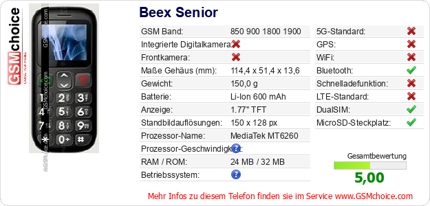 Hast du eigene Webseite? Willst du die Informationen über Standarddaten des Handys Beex Senior irgendwo veröffentlichen? Das ist sehr einfach. Du kannst das Bild herunterladen oder kopieren und auf der Webseite folgenden Code hinzufügen:Das Einfügen von diesem Code verursacht das Anzeigen von dem folgenden Bild: