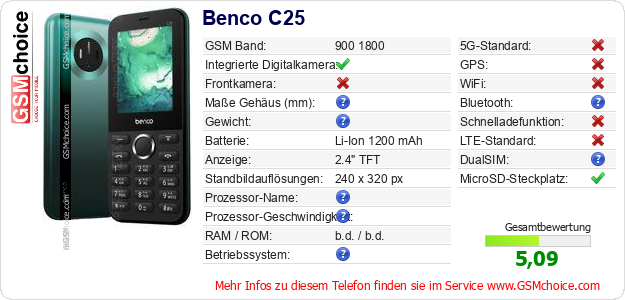 Hast du eigene Webseite? Willst du die Informationen über Standarddaten des Handys Benco C25 irgendwo veröffentlichen? Das ist sehr einfach. Du kannst das Bild herunterladen oder kopieren und auf der Webseite folgenden Code hinzufügen:Das Einfügen von diesem Code verursacht das Anzeigen von dem folgenden Bild: