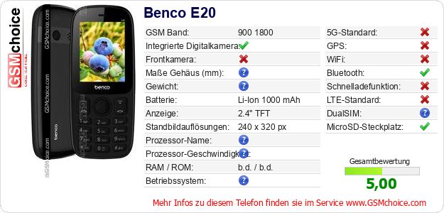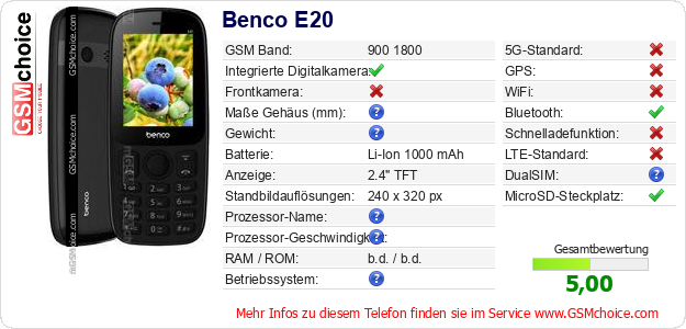 Hast du eigene Webseite? Willst du die Informationen über Standarddaten des Handys Benco E20 irgendwo veröffentlichen? Das ist sehr einfach. Du kannst das Bild herunterladen oder kopieren und auf der Webseite folgenden Code hinzufügen:Das Einfügen von diesem Code verursacht das Anzeigen von dem folgenden Bild: