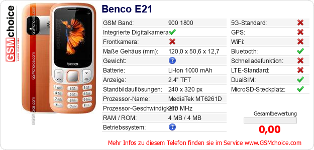 Hast du eigene Webseite? Willst du die Informationen über Standarddaten des Handys Benco E21 irgendwo veröffentlichen? Das ist sehr einfach. Du kannst das Bild herunterladen oder kopieren und auf der Webseite folgenden Code hinzufügen:Das Einfügen von diesem Code verursacht das Anzeigen von dem folgenden Bild: