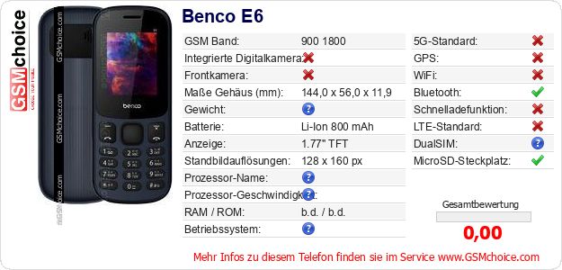 Hast du eigene Webseite? Willst du die Informationen über Standarddaten des Handys Benco E6 irgendwo veröffentlichen? Das ist sehr einfach. Du kannst das Bild herunterladen oder kopieren und auf der Webseite folgenden Code hinzufügen:Das Einfügen von diesem Code verursacht das Anzeigen von dem folgenden Bild: