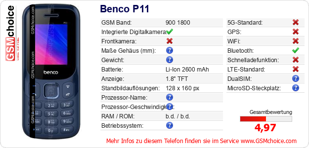 Hast du eigene Webseite? Willst du die Informationen über Standarddaten des Handys Benco P11 irgendwo veröffentlichen? Das ist sehr einfach. Du kannst das Bild herunterladen oder kopieren und auf der Webseite folgenden Code hinzufügen:Das Einfügen von diesem Code verursacht das Anzeigen von dem folgenden Bild: