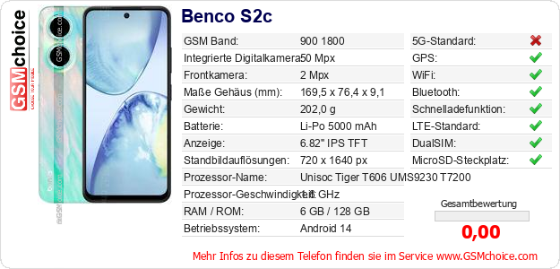 Hast du eigene Webseite? Willst du die Informationen über Standarddaten des Handys Benco S2c irgendwo veröffentlichen? Das ist sehr einfach. Du kannst das Bild herunterladen oder kopieren und auf der Webseite folgenden Code hinzufügen:Das Einfügen von diesem Code verursacht das Anzeigen von dem folgenden Bild: