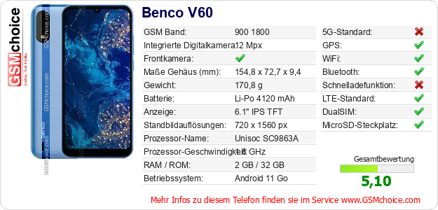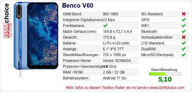 Hast du eigene Webseite? Willst du die Informationen über Standarddaten des Handys Benco V60 irgendwo veröffentlichen? Das ist sehr einfach. Du kannst das Bild herunterladen oder kopieren und auf der Webseite folgenden Code hinzufügen:Das Einfügen von diesem Code verursacht das Anzeigen von dem folgenden Bild: