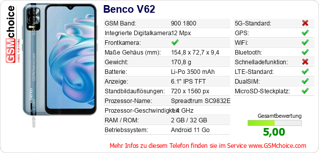 Hast du eigene Webseite? Willst du die Informationen über Standarddaten des Handys Benco V62 irgendwo veröffentlichen? Das ist sehr einfach. Du kannst das Bild herunterladen oder kopieren und auf der Webseite folgenden Code hinzufügen:Das Einfügen von diesem Code verursacht das Anzeigen von dem folgenden Bild: