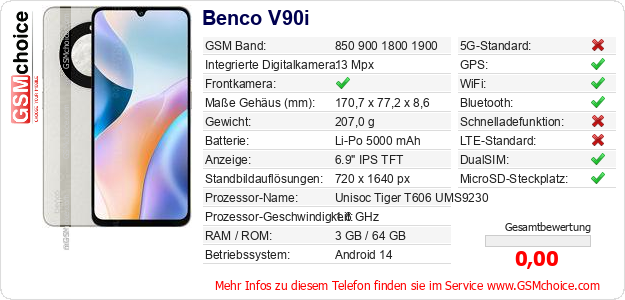 Hast du eigene Webseite? Willst du die Informationen über Standarddaten des Handys Benco V90i irgendwo veröffentlichen? Das ist sehr einfach. Du kannst das Bild herunterladen oder kopieren und auf der Webseite folgenden Code hinzufügen:Das Einfügen von diesem Code verursacht das Anzeigen von dem folgenden Bild: