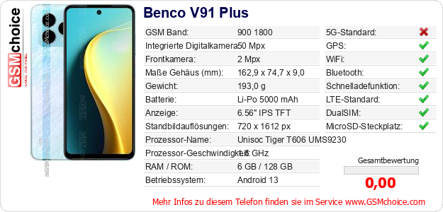 Hast du eigene Webseite? Willst du die Informationen über Standarddaten des Handys Benco V91 Plus irgendwo veröffentlichen? Das ist sehr einfach. Du kannst das Bild herunterladen oder kopieren und auf der Webseite folgenden Code hinzufügen:Das Einfügen von diesem Code verursacht das Anzeigen von dem folgenden Bild: