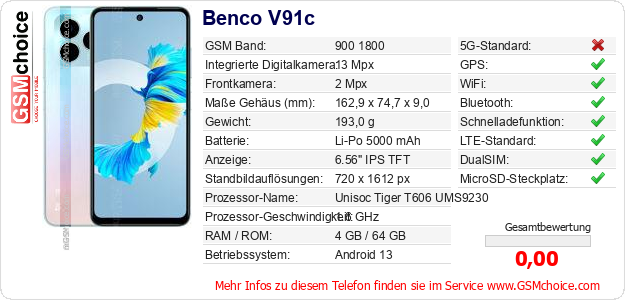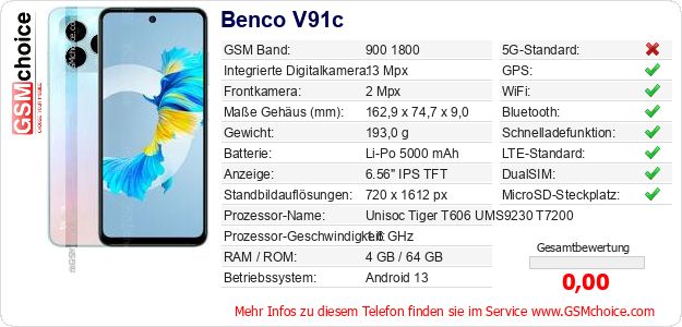 Hast du eigene Webseite? Willst du die Informationen über Standarddaten des Handys Benco V91c irgendwo veröffentlichen? Das ist sehr einfach. Du kannst das Bild herunterladen oder kopieren und auf der Webseite folgenden Code hinzufügen:Das Einfügen von diesem Code verursacht das Anzeigen von dem folgenden Bild: