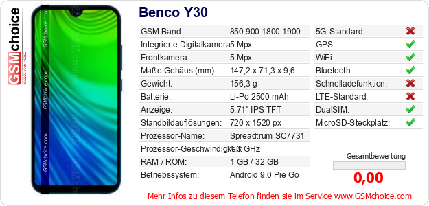 Hast du eigene Webseite? Willst du die Informationen über Standarddaten des Handys Benco Y30 irgendwo veröffentlichen? Das ist sehr einfach. Du kannst das Bild herunterladen oder kopieren und auf der Webseite folgenden Code hinzufügen:Das Einfügen von diesem Code verursacht das Anzeigen von dem folgenden Bild:
