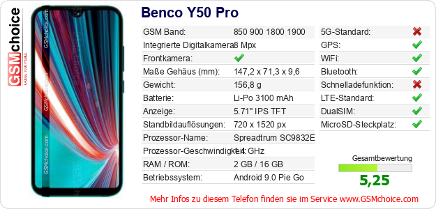 Hast du eigene Webseite? Willst du die Informationen über Standarddaten des Handys Benco Y50 Pro irgendwo veröffentlichen? Das ist sehr einfach. Du kannst das Bild herunterladen oder kopieren und auf der Webseite folgenden Code hinzufügen:Das Einfügen von diesem Code verursacht das Anzeigen von dem folgenden Bild: