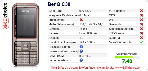 Hast du eigene Webseite? Willst du die Informationen über Standarddaten des Handys BenQ C30 irgendwo veröffentlichen? Das ist sehr einfach. Du kannst das Bild herunterladen oder kopieren und auf der Webseite folgenden Code hinzufügen:Das Einfügen von diesem Code verursacht das Anzeigen von dem folgenden Bild: