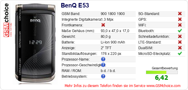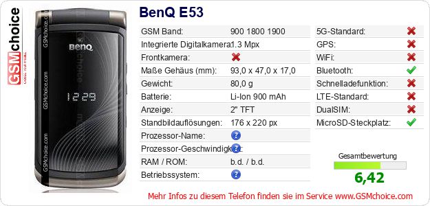 Hast du eigene Webseite? Willst du die Informationen über Standarddaten des Handys BenQ E53 irgendwo veröffentlichen? Das ist sehr einfach. Du kannst das Bild herunterladen oder kopieren und auf der Webseite folgenden Code hinzufügen:Das Einfügen von diesem Code verursacht das Anzeigen von dem folgenden Bild: