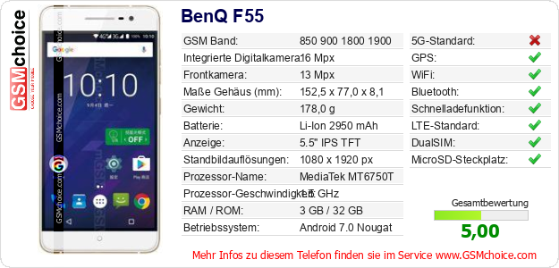 Hast du eigene Webseite? Willst du die Informationen über Standarddaten des Handys BenQ F55 irgendwo veröffentlichen? Das ist sehr einfach. Du kannst das Bild herunterladen oder kopieren und auf der Webseite folgenden Code hinzufügen:Das Einfügen von diesem Code verursacht das Anzeigen von dem folgenden Bild: