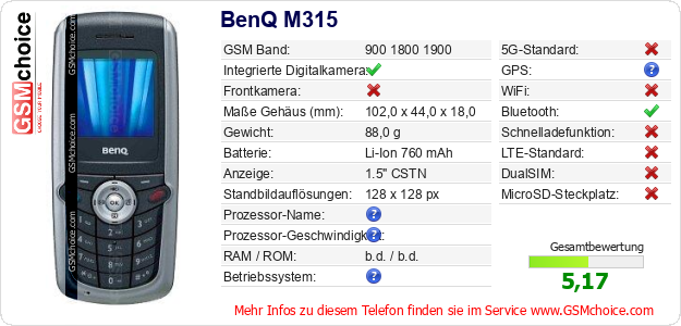 Hast du eigene Webseite? Willst du die Informationen über Standarddaten des Handys BenQ M315 irgendwo veröffentlichen? Das ist sehr einfach. Du kannst das Bild herunterladen oder kopieren und auf der Webseite folgenden Code hinzufügen:Das Einfügen von diesem Code verursacht das Anzeigen von dem folgenden Bild: