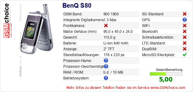 Hast du eigene Webseite? Willst du die Informationen über Standarddaten des Handys BenQ S80 irgendwo veröffentlichen? Das ist sehr einfach. Du kannst das Bild herunterladen oder kopieren und auf der Webseite folgenden Code hinzufügen:Das Einfügen von diesem Code verursacht das Anzeigen von dem folgenden Bild: