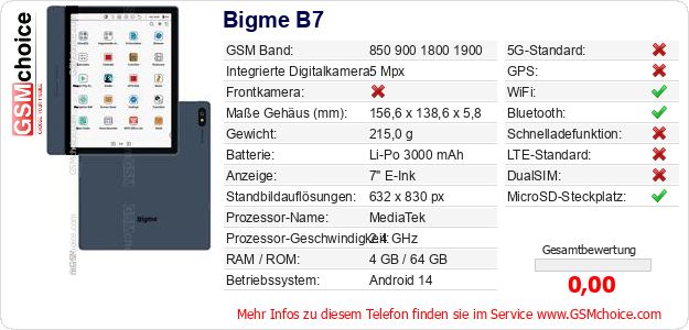 Hast du eigene Webseite? Willst du die Informationen über Standarddaten des Handys Bigme B7 irgendwo veröffentlichen? Das ist sehr einfach. Du kannst das Bild herunterladen oder kopieren und auf der Webseite folgenden Code hinzufügen:Das Einfügen von diesem Code verursacht das Anzeigen von dem folgenden Bild: