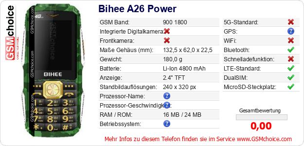 Hast du eigene Webseite? Willst du die Informationen über Standarddaten des Handys Bihee A26 Power irgendwo veröffentlichen? Das ist sehr einfach. Du kannst das Bild herunterladen oder kopieren und auf der Webseite folgenden Code hinzufügen:Das Einfügen von diesem Code verursacht das Anzeigen von dem folgenden Bild: