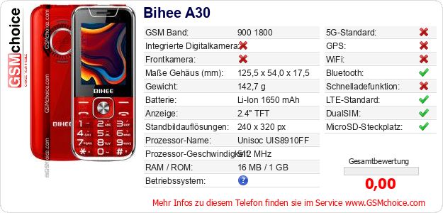 Hast du eigene Webseite? Willst du die Informationen über Standarddaten des Handys Bihee A30 irgendwo veröffentlichen? Das ist sehr einfach. Du kannst das Bild herunterladen oder kopieren und auf der Webseite folgenden Code hinzufügen:Das Einfügen von diesem Code verursacht das Anzeigen von dem folgenden Bild: