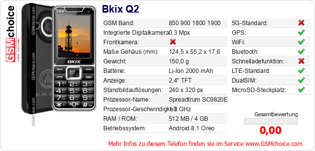 Hast du eigene Webseite? Willst du die Informationen über Standarddaten des Handys Bkix Q2 irgendwo veröffentlichen? Das ist sehr einfach. Du kannst das Bild herunterladen oder kopieren und auf der Webseite folgenden Code hinzufügen:Das Einfügen von diesem Code verursacht das Anzeigen von dem folgenden Bild:
