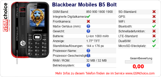 Hast du eigene Webseite? Willst du die Informationen über Standarddaten des Handys Blackbear Mobiles B5 Bolt irgendwo veröffentlichen? Das ist sehr einfach. Du kannst das Bild herunterladen oder kopieren und auf der Webseite folgenden Code hinzufügen:Das Einfügen von diesem Code verursacht das Anzeigen von dem folgenden Bild: