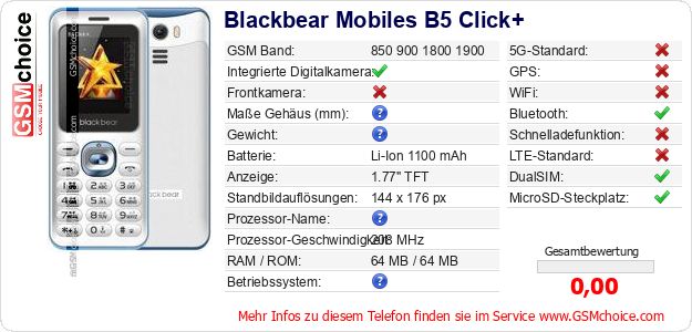 Hast du eigene Webseite? Willst du die Informationen über Standarddaten des Handys Blackbear Mobiles B5 Click+ irgendwo veröffentlichen? Das ist sehr einfach. Du kannst das Bild herunterladen oder kopieren und auf der Webseite folgenden Code hinzufügen:Das Einfügen von diesem Code verursacht das Anzeigen von dem folgenden Bild: