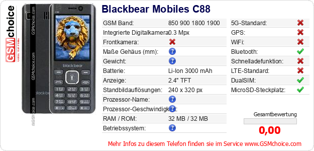 Hast du eigene Webseite? Willst du die Informationen über Standarddaten des Handys Blackbear Mobiles C88 irgendwo veröffentlichen? Das ist sehr einfach. Du kannst das Bild herunterladen oder kopieren und auf der Webseite folgenden Code hinzufügen:Das Einfügen von diesem Code verursacht das Anzeigen von dem folgenden Bild: