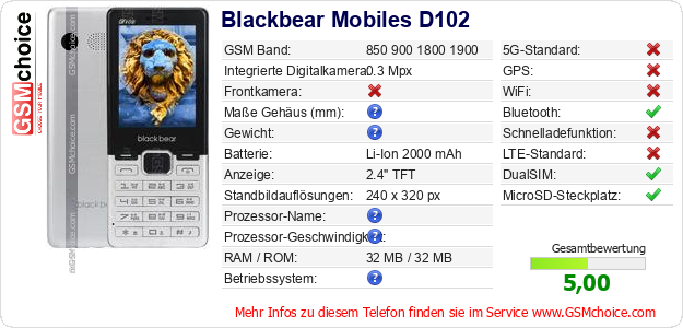 Hast du eigene Webseite? Willst du die Informationen über Standarddaten des Handys Blackbear Mobiles D102 irgendwo veröffentlichen? Das ist sehr einfach. Du kannst das Bild herunterladen oder kopieren und auf der Webseite folgenden Code hinzufügen:Das Einfügen von diesem Code verursacht das Anzeigen von dem folgenden Bild:
