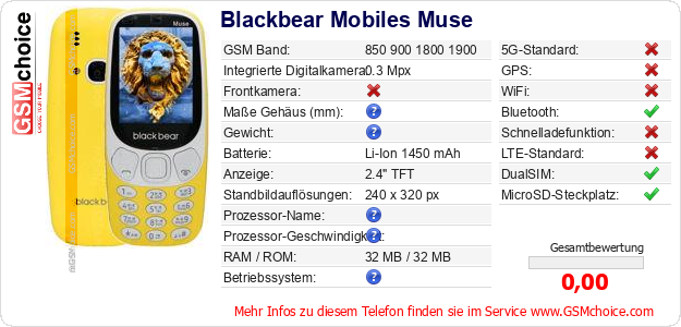 Hast du eigene Webseite? Willst du die Informationen über Standarddaten des Handys Blackbear Mobiles Muse irgendwo veröffentlichen? Das ist sehr einfach. Du kannst das Bild herunterladen oder kopieren und auf der Webseite folgenden Code hinzufügen:Das Einfügen von diesem Code verursacht das Anzeigen von dem folgenden Bild: