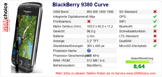 Hast du eigene Webseite? Willst du die Informationen über Standarddaten des Handys BlackBerry 9380 Curve irgendwo veröffentlichen? Das ist sehr einfach. Du kannst das Bild herunterladen oder kopieren und auf der Webseite folgenden Code hinzufügen:Das Einfügen von diesem Code verursacht das Anzeigen von dem folgenden Bild: