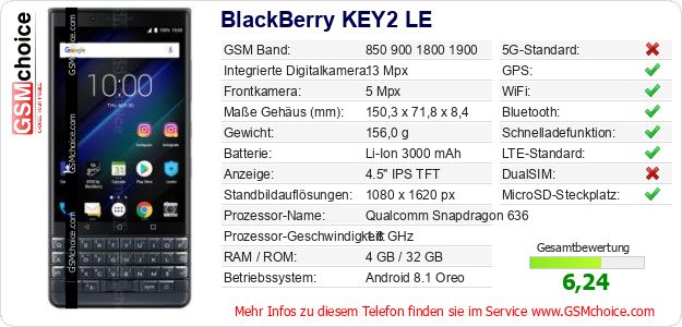 Hast du eigene Webseite? Willst du die Informationen über Standarddaten des Handys BlackBerry KEY2 LE irgendwo veröffentlichen? Das ist sehr einfach. Du kannst das Bild herunterladen oder kopieren und auf der Webseite folgenden Code hinzufügen:Das Einfügen von diesem Code verursacht das Anzeigen von dem folgenden Bild: