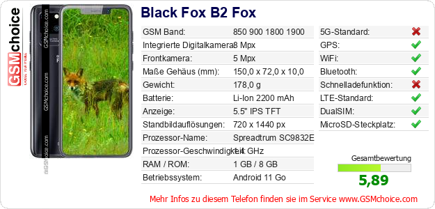 Hast du eigene Webseite? Willst du die Informationen über Standarddaten des Handys Black Fox B2 Fox irgendwo veröffentlichen? Das ist sehr einfach. Du kannst das Bild herunterladen oder kopieren und auf der Webseite folgenden Code hinzufügen:Das Einfügen von diesem Code verursacht das Anzeigen von dem folgenden Bild:
