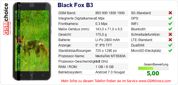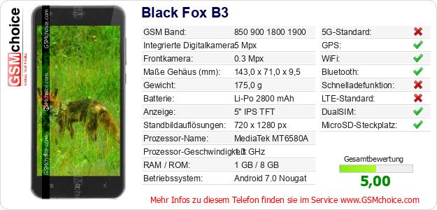 Hast du eigene Webseite? Willst du die Informationen über Standarddaten des Handys Black Fox B3 irgendwo veröffentlichen? Das ist sehr einfach. Du kannst das Bild herunterladen oder kopieren und auf der Webseite folgenden Code hinzufügen:Das Einfügen von diesem Code verursacht das Anzeigen von dem folgenden Bild: