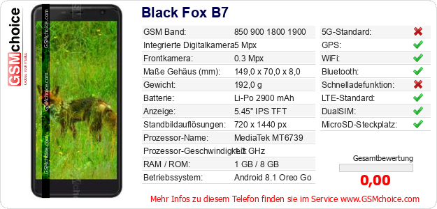Hast du eigene Webseite? Willst du die Informationen über Standarddaten des Handys Black Fox B7 irgendwo veröffentlichen? Das ist sehr einfach. Du kannst das Bild herunterladen oder kopieren und auf der Webseite folgenden Code hinzufügen:Das Einfügen von diesem Code verursacht das Anzeigen von dem folgenden Bild: