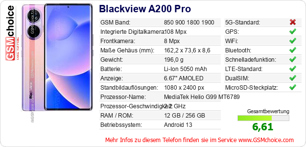 Hast du eigene Webseite? Willst du die Informationen über Standarddaten des Handys Blackview A200 Pro irgendwo veröffentlichen? Das ist sehr einfach. Du kannst das Bild herunterladen oder kopieren und auf der Webseite folgenden Code hinzufügen:Das Einfügen von diesem Code verursacht das Anzeigen von dem folgenden Bild: