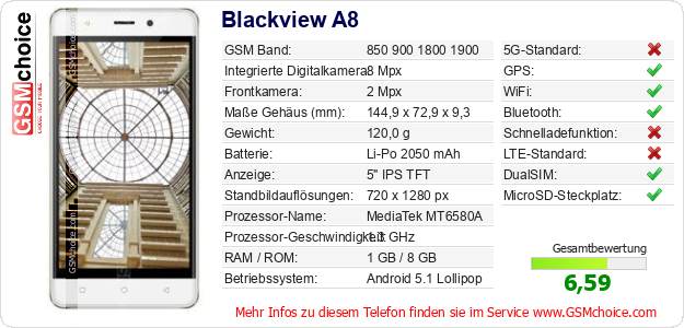 Hast du eigene Webseite? Willst du die Informationen über Standarddaten des Handys Blackview A8 irgendwo veröffentlichen? Das ist sehr einfach. Du kannst das Bild herunterladen oder kopieren und auf der Webseite folgenden Code hinzufügen:Das Einfügen von diesem Code verursacht das Anzeigen von dem folgenden Bild: