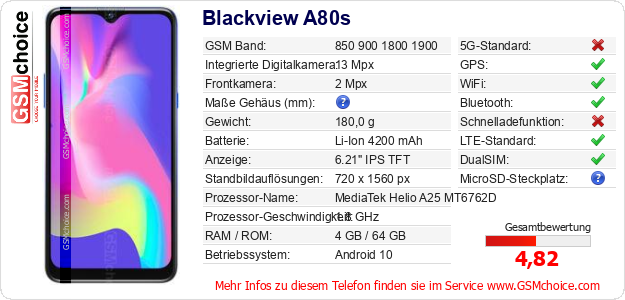 Hast du eigene Webseite? Willst du die Informationen über Standarddaten des Handys Blackview A80s irgendwo veröffentlichen? Das ist sehr einfach. Du kannst das Bild herunterladen oder kopieren und auf der Webseite folgenden Code hinzufügen:Das Einfügen von diesem Code verursacht das Anzeigen von dem folgenden Bild: