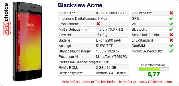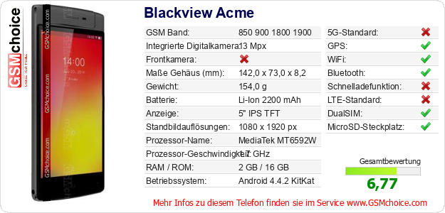 Hast du eigene Webseite? Willst du die Informationen über Standarddaten des Handys Blackview Acme irgendwo veröffentlichen? Das ist sehr einfach. Du kannst das Bild herunterladen oder kopieren und auf der Webseite folgenden Code hinzufügen:Das Einfügen von diesem Code verursacht das Anzeigen von dem folgenden Bild: