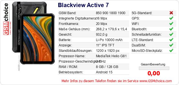 Hast du eigene Webseite? Willst du die Informationen über Standarddaten des Handys Blackview Active 7 irgendwo veröffentlichen? Das ist sehr einfach. Du kannst das Bild herunterladen oder kopieren und auf der Webseite folgenden Code hinzufügen:Das Einfügen von diesem Code verursacht das Anzeigen von dem folgenden Bild: