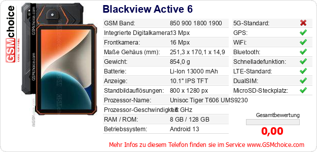 Hast du eigene Webseite? Willst du die Informationen über Standarddaten des Handys Blackview Active 6 irgendwo veröffentlichen? Das ist sehr einfach. Du kannst das Bild herunterladen oder kopieren und auf der Webseite folgenden Code hinzufügen:Das Einfügen von diesem Code verursacht das Anzeigen von dem folgenden Bild: