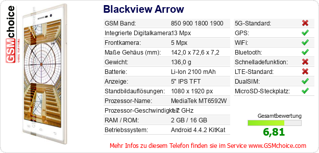 Daten des Mobiltelefons Blackview Arrow auf Ihrer Seite