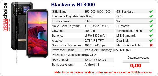 Hast du eigene Webseite? Willst du die Informationen über Standarddaten des Handys Blackview BL8000 irgendwo veröffentlichen? Das ist sehr einfach. Du kannst das Bild herunterladen oder kopieren und auf der Webseite folgenden Code hinzufügen:Das Einfügen von diesem Code verursacht das Anzeigen von dem folgenden Bild: